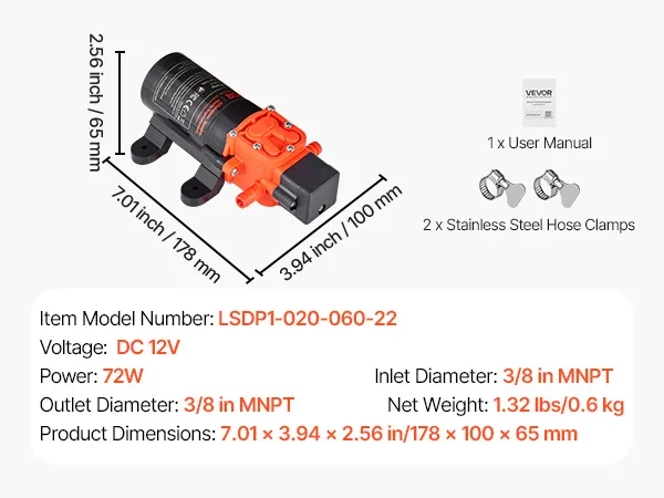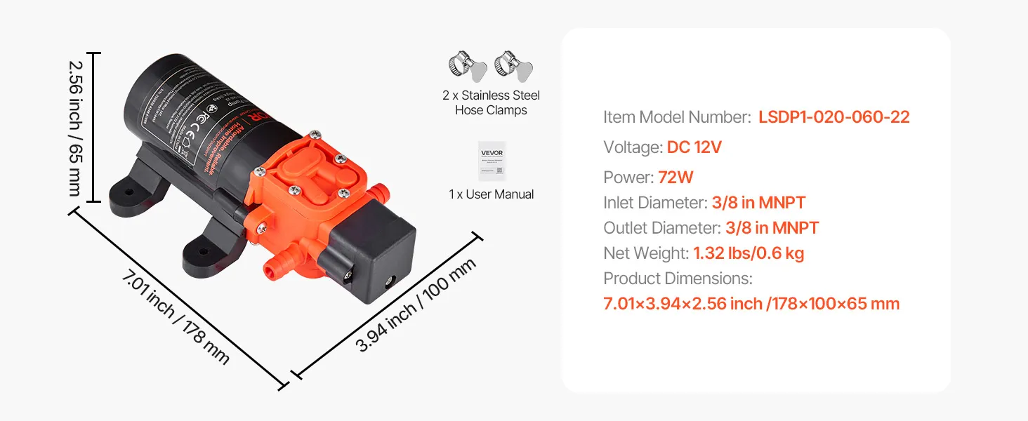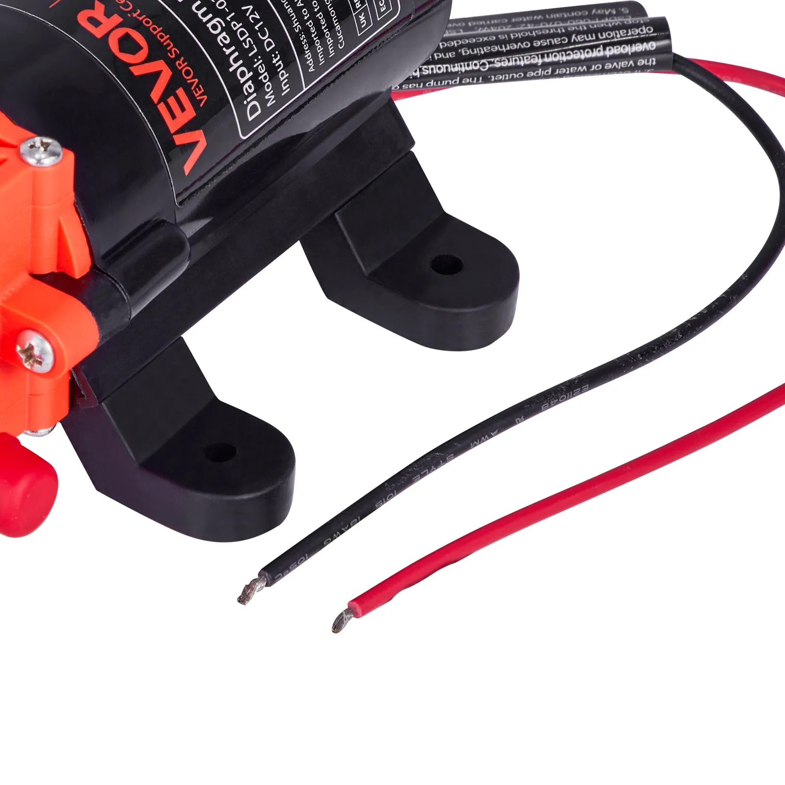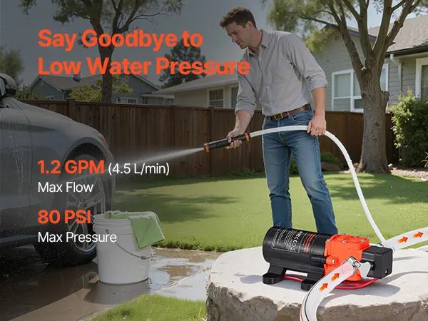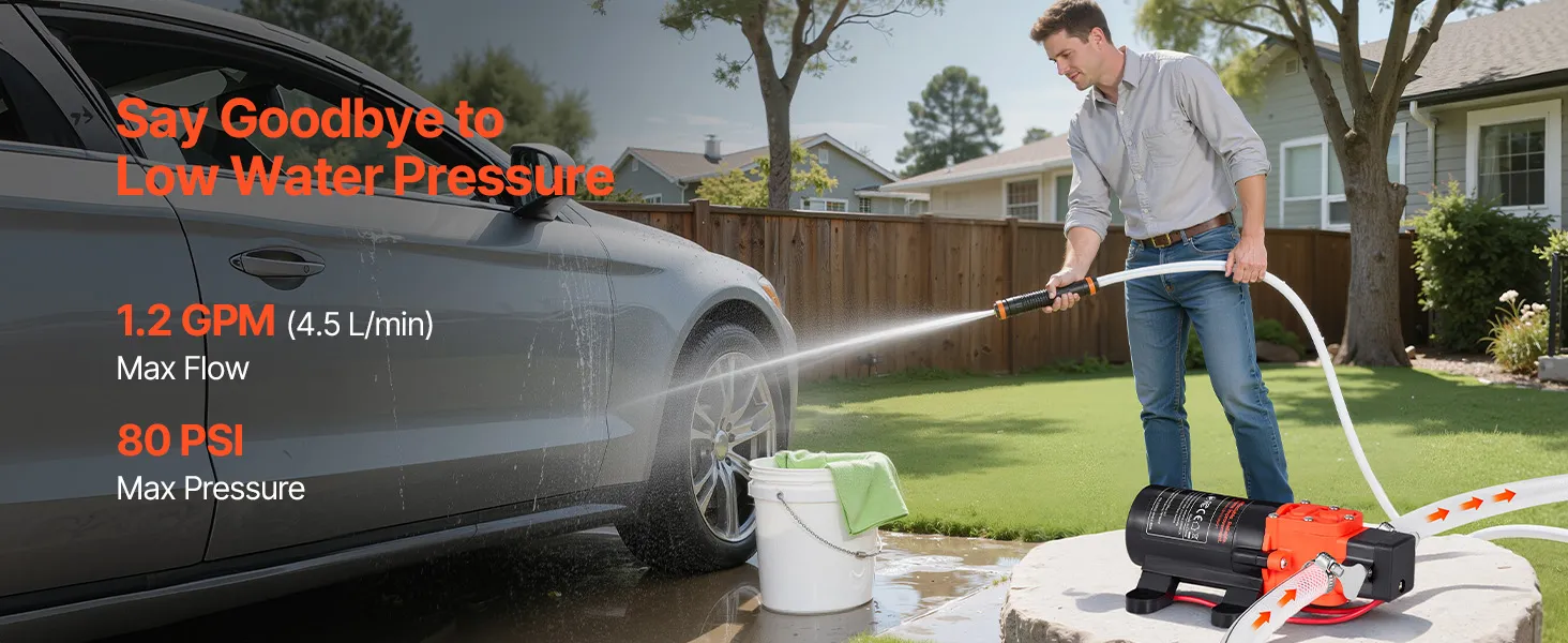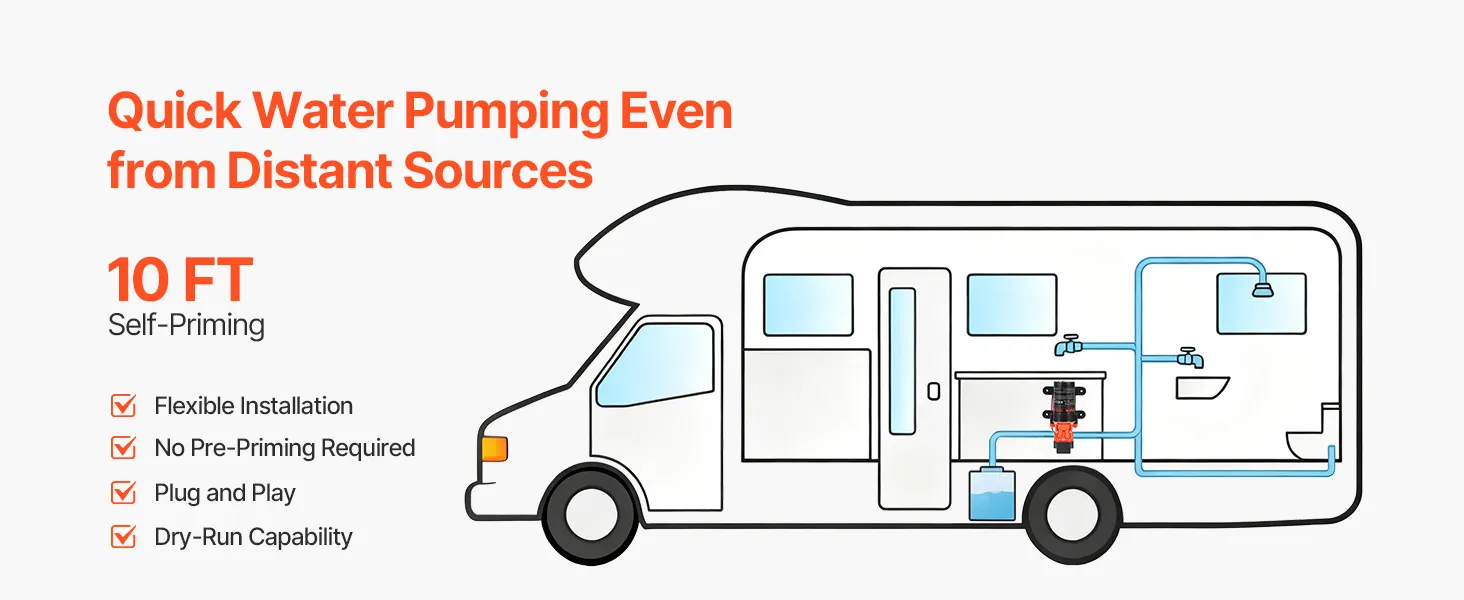 Hochleistungspumpe mit 1,2 GPM (4,5 L/min): Unsere leistungsstarke 12-V-Membranpumpe liefert einen maximalen Durchfluss von 1,2 GPM (4,5 L/min), einen maximalen Druck von 80 PSI (5,5 bar) und eine selbstansaugende Höhe von 10 Fuß (3 m). Schnelles Ansaugen von Wasser aus entfernten Tanks ohne Vorfüllen – unterstützt kurze Trockenstarts