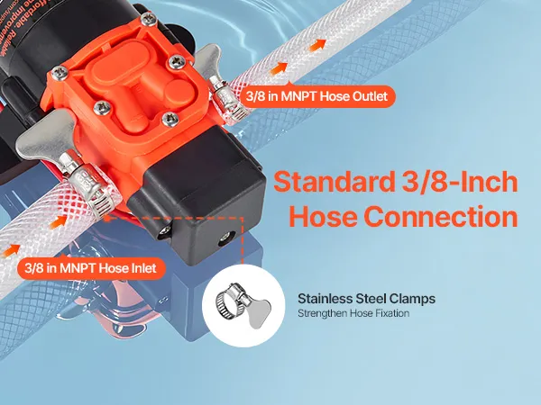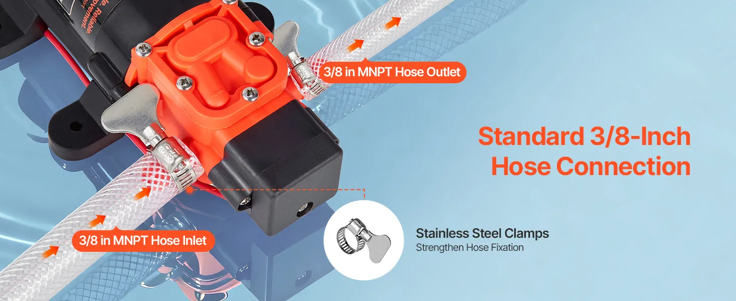 3/8-Zoll-Schlauchanschluss: Ausgestattet mit einem Schlauchadapter lässt sich unsere Membranpumpe schnell an jeden Standard-3/8-Zoll-Schlauch anschließen. Edelstahlklemmen verstärken die Verbindung, PTFE-Band verbessert die Gewindeabdichtung, um Leckagen zu vermeiden, und der Filter blockiert grobe Ablagerungen