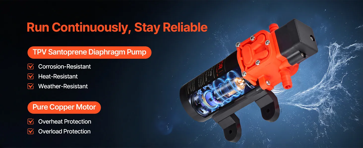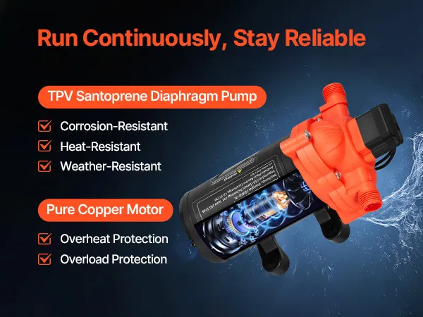 Sicherer und langlebiger Betrieb: Dank des reinen Kupfermotors und des integrierten Überhitzungs- und Überlastungsschutzes arbeitet diese Membranwasserpumpe sicher und zuverlässig. Sie verhindert ein Durchbrennen und verlängert die Lebensdauer für dauerhafte Zuverlässigkeit.