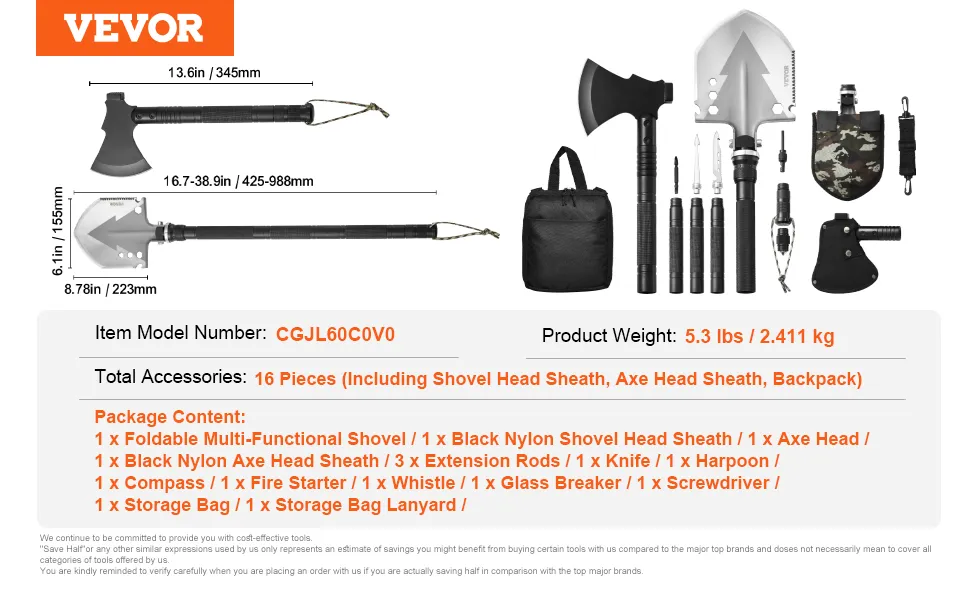 Vielseitiges Camping-Multitool-Set: Dieses Camping-Set enthält eine Schaufel, eine Axt, ein Messer, einen Kompass, eine Pfeife, einen Glasbrecher, einen Fischspeer, einen Feueranzünder und mehr. Perfekt zum Graben, Hacken, Feuermachen, Schneiden, Signalisieren und Flaschenöffnen – ideal für das Überleben im Freien, Camping, Wandern und Abenteuer in der Wildnis.