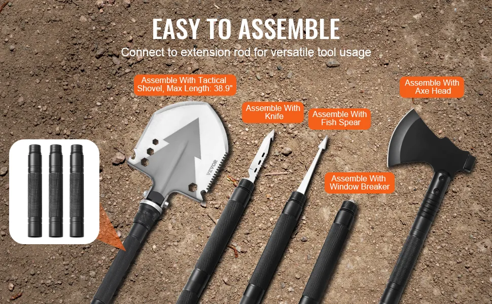 Sie können die tragbare Survival-Schaufel mit den Verlängerungsstangen kombinieren, um die Funktionalität zu maximieren und jedes Werkzeug für andere Anwendungen anzupassen!