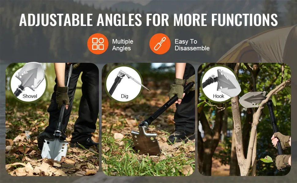 Die Schaufel bietet Winkeleinstellungen für zusätzliche Funktionalität zum Graben, Hacken, Ausgraben oder sogar zum Einhaken von Ästen und ist somit in jeder Umgebung im Freien vielseitig einsetzbar.