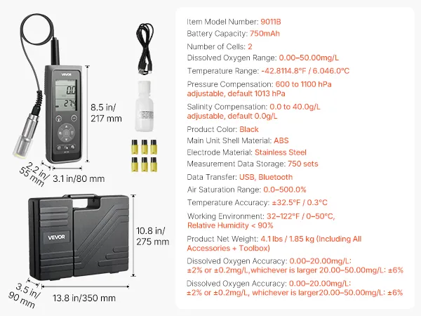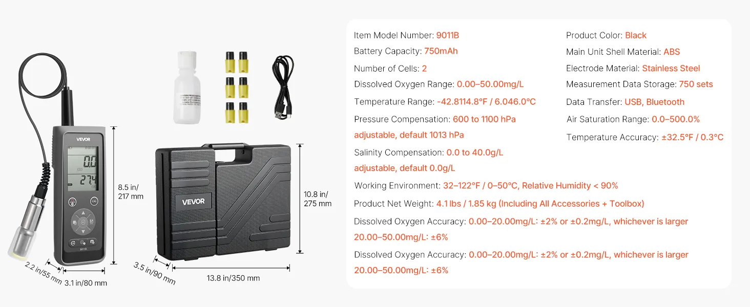 Hohe Präzision: Unser Sauerstofftester verfügt über automatische Temperatur-, manuelle Druck- und Salzgehaltskompensation und gewährleistet so präzise Ergebnisse bei unterschiedlichen Wasserbedingungen. Maximale Genauigkeit: ±2 % für gelösten Sauerstoff/Luftsättigung und ±32,5 °F (0,3 °C) für die Temperatur