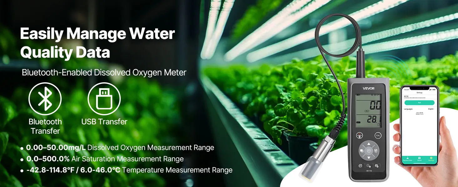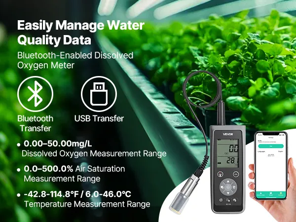 VEVOR Messgerät für gelösten Sauerstoff, Messbereich 0,0–50,0 mg/L, tragbares Testset mit 4 m Elektrodenkabel & Bluetooth/USB-Datenübertragung, Speicherung von Datensätzen, DO-Messgerät