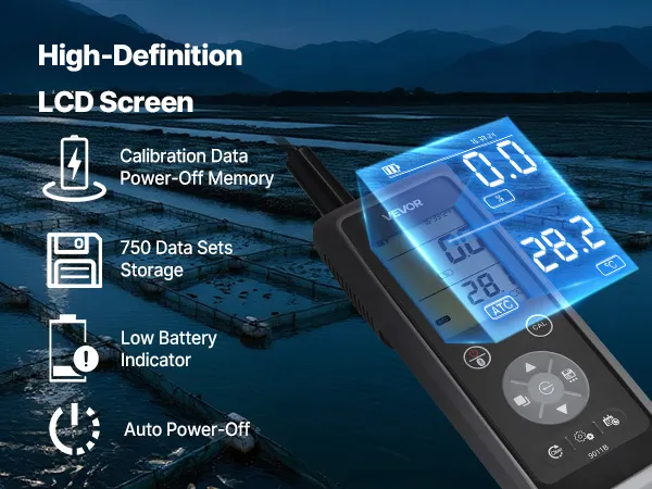 Praktische Funktionen: Unser Teich-Sauerstoffmessgerät speichert bis zu 750 Datensätze und lässt sich einfach abrufen. Die Batteriewarnung und die automatische Abschaltung verlängern die Batterielebensdauer. Das nach hinten geneigte Design ermöglicht die Verwendung auf dem Schreibtisch. Audio-Feedback-Tasten sorgen für eine intuitive Bedienung