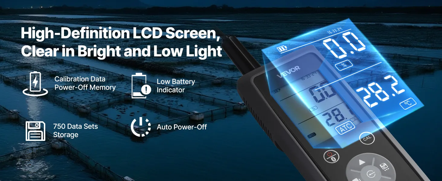 Der ultraklare LCD-Bildschirm ermöglicht ein einfaches Ablesen der Daten ohne Blendung. Selbst bei direkter Sonneneinstrahlung bleibt das Display des Sauerstoffmessgeräts hell und gut lesbar und liefert präzise Messwerte, wann immer Sie sie benötigen.