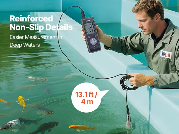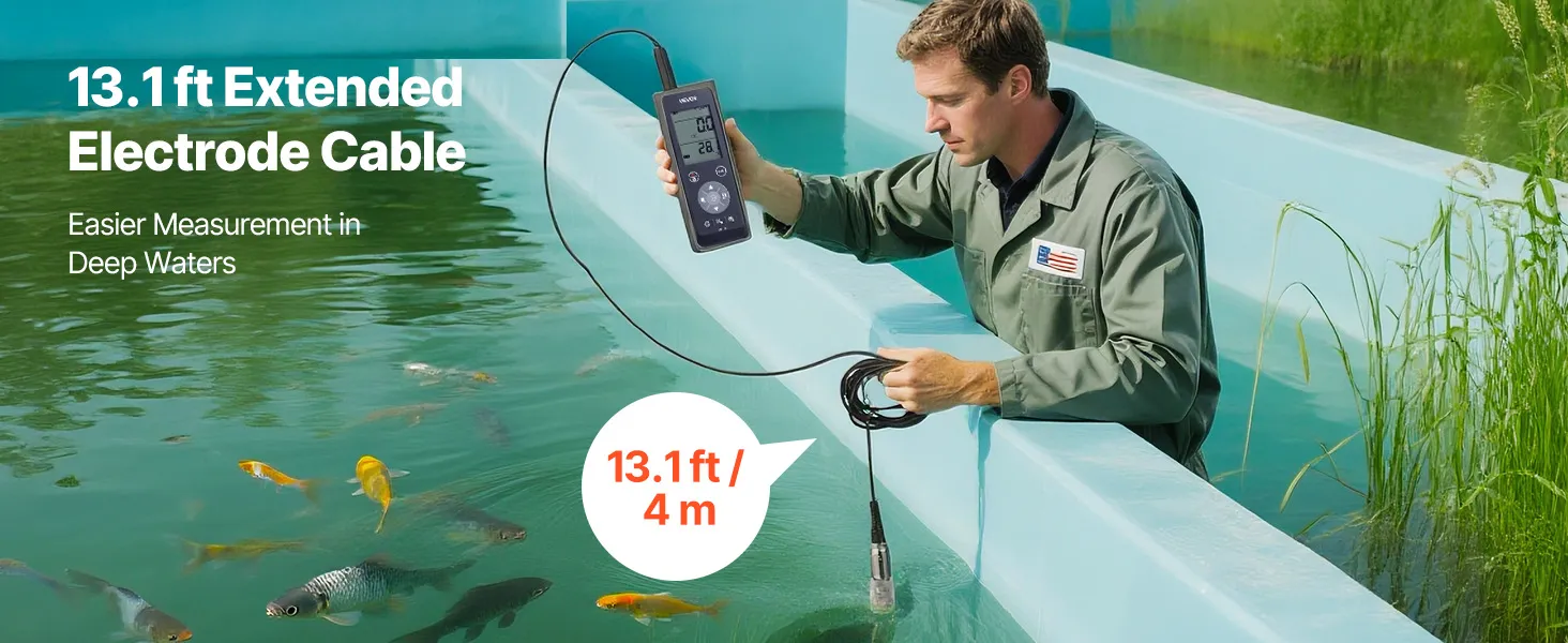 Die 4 m lange Elektrode erreicht problemlos tiefe Teiche, Brunnen oder große Wassertanks. Unser Sauerstofftester erleichtert die Feldarbeit und ermöglicht Ihnen die einfache Erfassung präziser Daten.