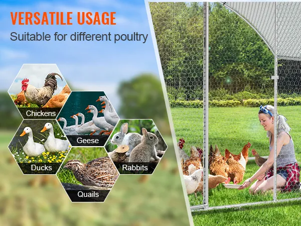 Der Hühnerstall von VEVOR ist vielseitig einsetzbar. Er eignet sich ideal für die Unterbringung von Hühnern, Kaninchen und anderen Kleintieren. Das geräumige Design bietet ausreichend Platz für mehrere Tiere; das macht ihn zu einer praktischen Wahl für verschiedene Bedürfnisse. Die Eigenschaften des Stalls gewährleisten die Sicherheit und den Komfort verschiedener Tiere in seiner Umgebung. Schutznetze und starke Rahmen sorgen für eine sichere Umgebung. Der einfache Montageprozess macht ihn für eine Vielzahl von Anwendungen praktisch. Egal, ob Sie einen Kaninchenstall oder einen Vogelkäfig benötigen, dieses Produkt passt gut.
