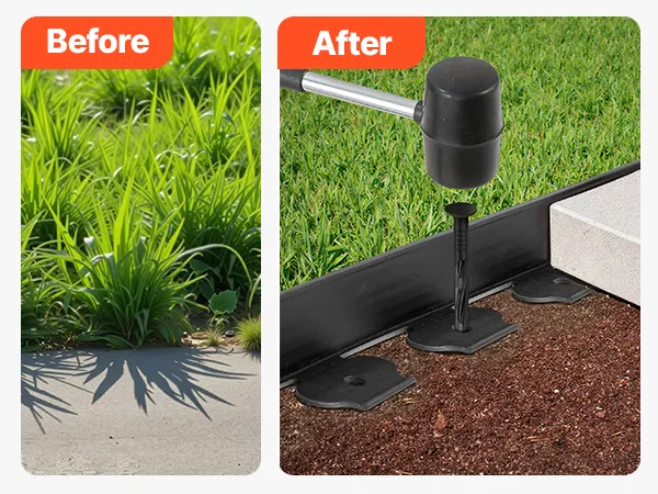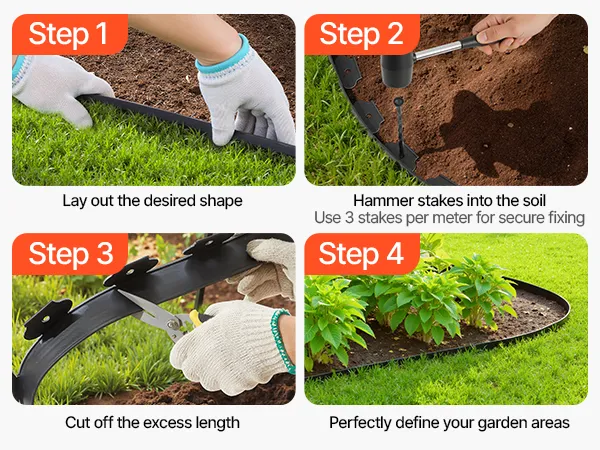 Einfacher Aufbau: Legen Sie die Beeteinfassungen entlang der Beetkante aus und befestigen Sie sie mit einem Hammer und den mitgelieferten Pfählen. Kein Graben oder Betonieren erforderlich.