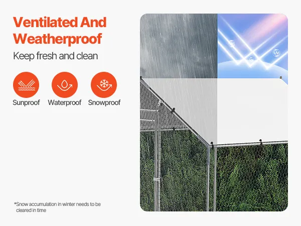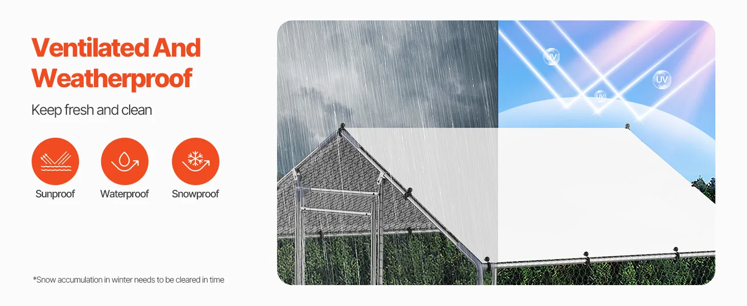 The large chicken run is equipped with four-sided ventilation to reduce odors. Remember to remove snow accumulation in winter to ensure your poultry has a cool environment.