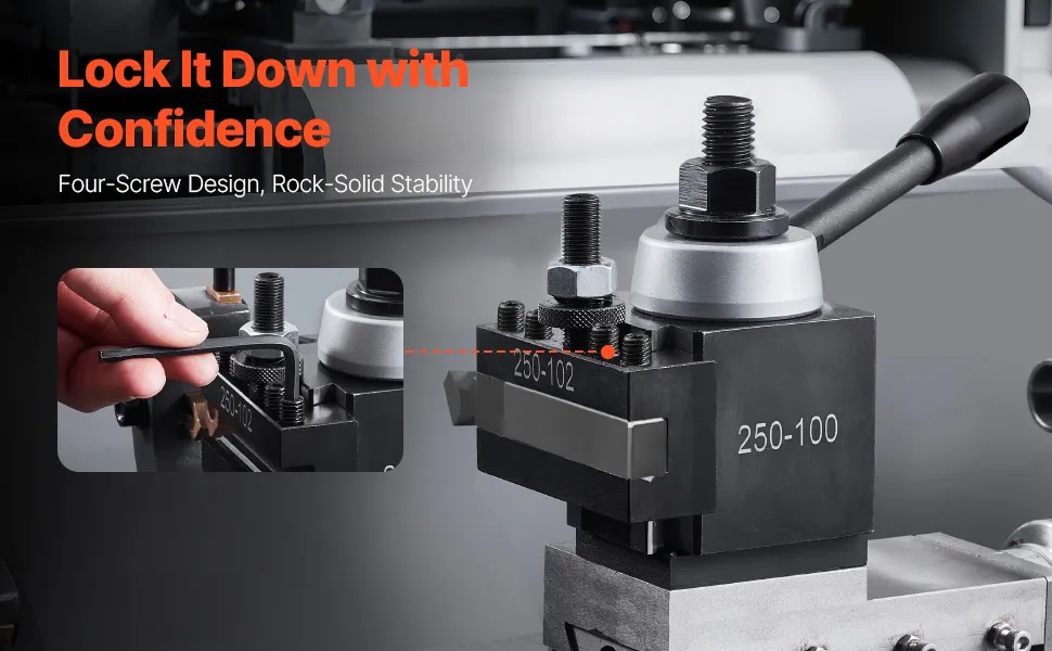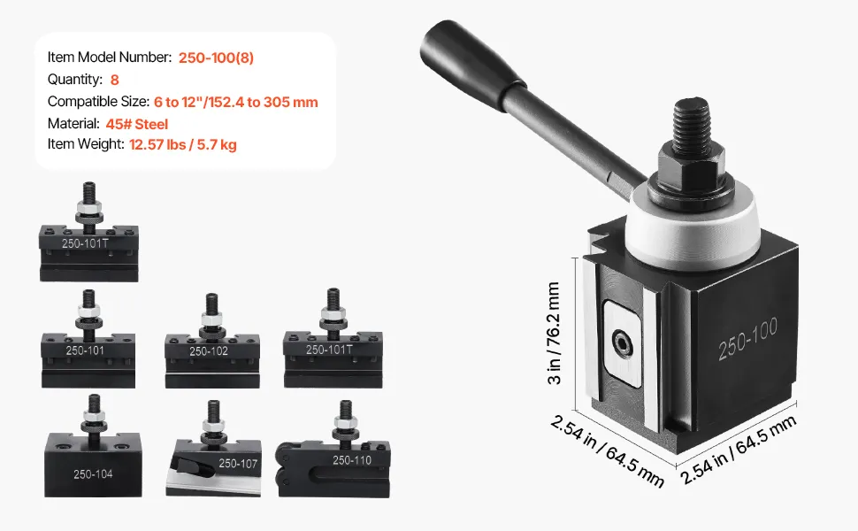 Unser Schnellwechsel-Werkzeughaltersatz passt auf 6- bis 12-Zoll-Drehmaschinen und funktioniert mit verschiedenen Modellen. Er ermöglicht schnelle Werkzeugwechsel mit einer Griffdrehung, präzise Ausrichtung mit einer Drehschraube und lange Haltbarkeit mit einer Gusseisenkonstruktion. Er ist einfach zu installieren und ideal für die Aufrüstung Ihrer Werkstatt.