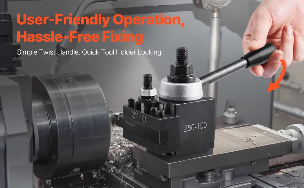 Schneller Werkzeugwechsel: Durch einfaches Drehen des Griffs können Sie diesen Schnellwechsel-Werkzeughalter für Drehmaschinen in Sekundenschnelle sichern und lösen. Dies vereinfacht den Austauschvorgang erheblich und verbessert die Arbeitseffizienz.