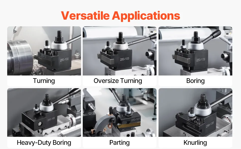 Dieser Schnellwechsel-Werkzeughalter für Drehmaschinen ist für eine Vielzahl von Drehaufgaben konzipiert, darunter Drehen, Übergrößendrehen, Bohren, Schwerlastbohren, Abstechen und Rändeln. Er verbessert die Leistung bei verschiedenen Bearbeitungsanwendungen.