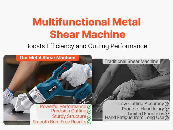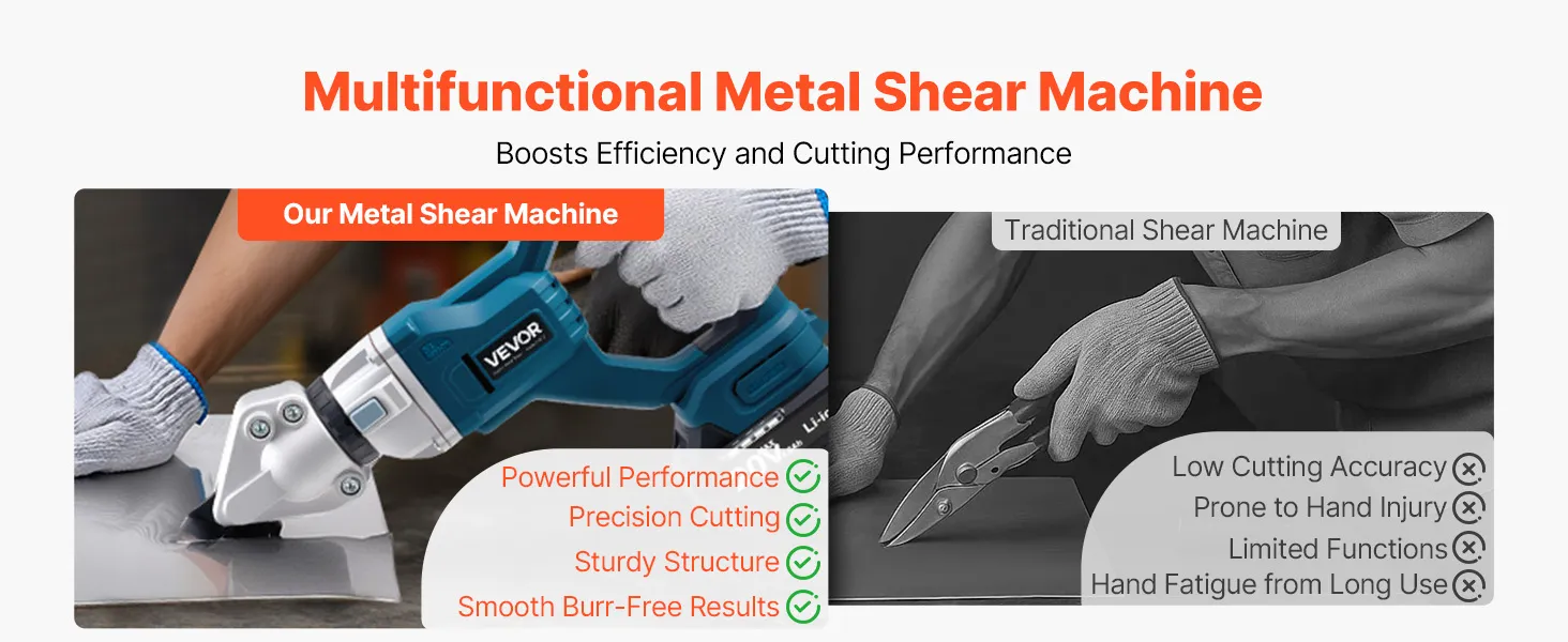 Betrieb mit variabler Geschwindigkeit: Mit der variablen Geschwindigkeitsregelung ist leichter Druck ideal für dünne Bleche, während starker Druck für dickere Materialien geeignet ist. Ob Sie 18 GA verzinkten Stahl, 20 GA Edelstahl oder 14 GA Aluminium schneiden, sorgt für effiziente Schnitte