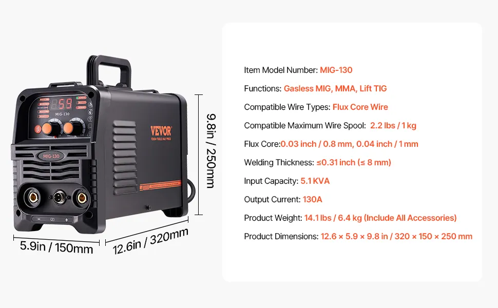 VEVOR MIG-Schweißgerät, 130 A synergetische MIG-Schweißmaschine, 3-in-1-Flusskern-MIG/MMA/Lift-TIG-Mehrprozess-Schweißer, Welder mit IGBT-Wechselrichtertechnologie und digitalem Anzeigebildschirm