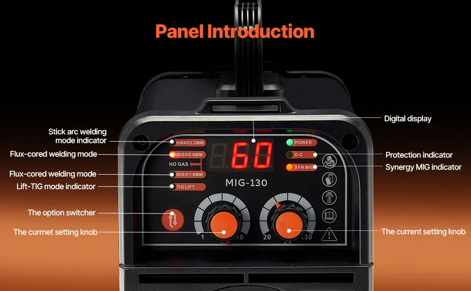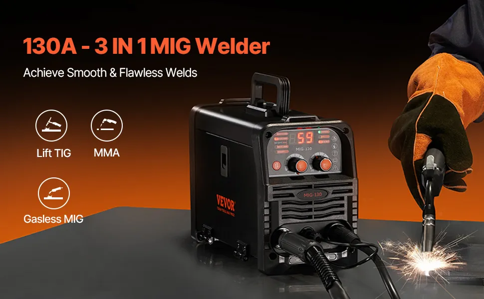 3-in-1-MIG-Schweißgerät: Dieses 130-Ampere-3-in-1-MIG-Schweißgerät unterstützt mehrere Schweißfunktionen – Lift-TIG, Gasflussmittel-MIG und MMA-Schweißen. Vielseitig und effizient, bewältigt es problemlos verschiedene Materialien und Schweißszenarien und bietet eine praktische und leistungsstarke Lösung für Ihre Schweißaufgaben. (Hinweis: Lift-TIG-Brenner ist nicht im Lieferumfang enthalten)