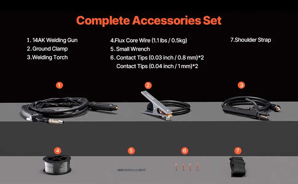 Dieses synergetische MIG-Schweißgerät wird mit einem kompletten Zubehörsatz geliefert, der Ihren Schweißanforderungen gerecht wird, Ihre Schweißaufgaben bequemer und effizienter macht. (Hinweis: Der Lift-WIG-Brenner ist nicht im Lieferumfang enthalten und muss separat erworben werden.)