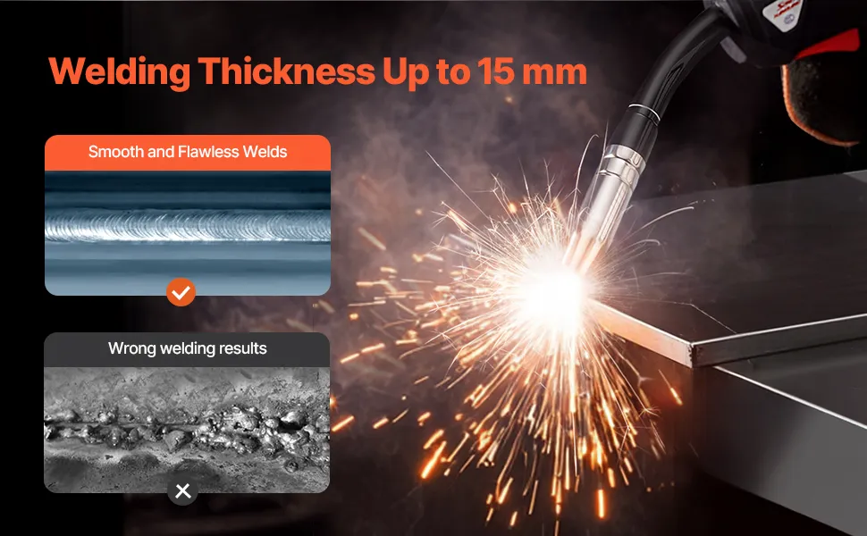 Hohe Leistung: Dieses Synergieschweißgerät liefert einen leistungsstarken Ausgangsstrom von 200 A und unterstützt Schweißdicken von bis zu 15 mm. Es ist mit verschiedenen Materialien kompatibel, darunter Weichstahl, Edelstahl, Gusseisen, Blech, Vierkantrohre und Metallkäfige, und erzielt glatte und makellose Schweißnähte!