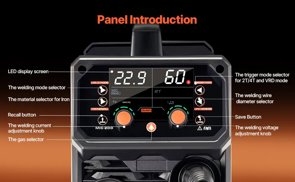 Das MIG-Schweißgerät ist mit einem LCD-Bildschirm ausgestattet, der ein klares und intuitives Bedienfeld für einfache und präzise Parametereinstellungen bietet. Es hilft Ihnen bei der schnellen Einrichtung, verbessert die Schweißeffizienz und bietet ein reibungsloseres Benutzererlebnis.