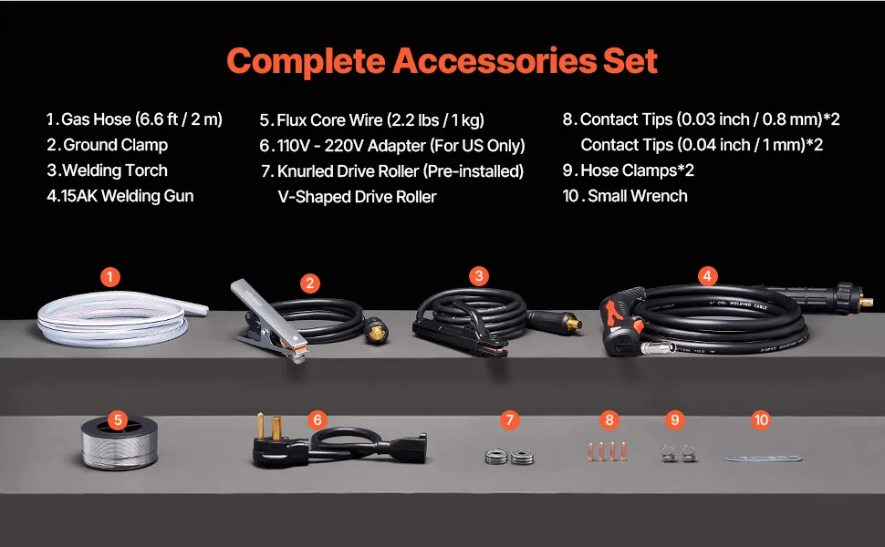 Drahtkompatibilität: Unser MIG-Schweißgerät ist mit Fülldraht und Gas-Massivdraht kompatibel, mit einer maximalen Drahtkapazität von 5 kg. Geeignet für Fülldraht und Massivdraht mit 0,03 Zoll (0,8 mm) und 0,04 Zoll (1,0 mm) und erfüllt die Anforderungen verschiedener Schweißaufgaben.