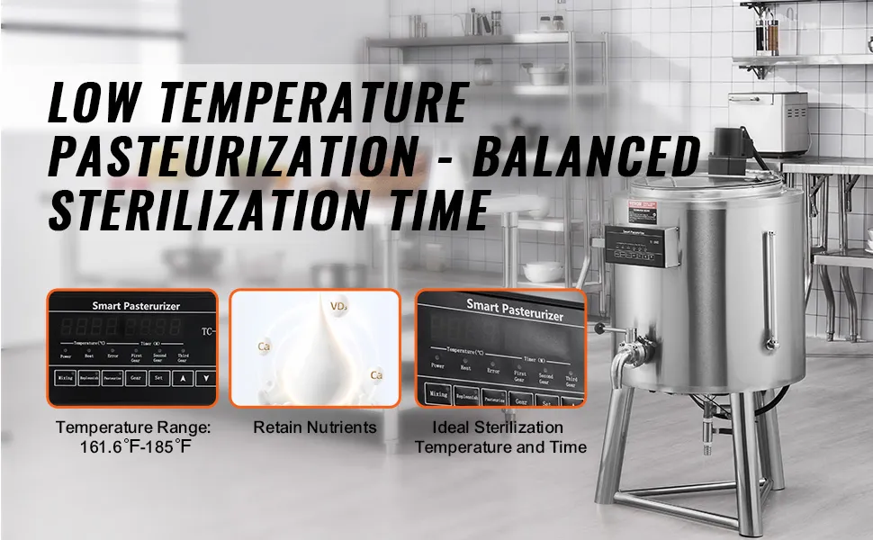 Zuverlässiges Edelstahlmaterial: Der Innentank ist aus lebensmittelechtem 304-Edelstahl gefertigt und hat ein nahtloses, langlebiges und korrosionsbeständiges Design. Er ist leicht zu reinigen und erfüllt die Lebensmittelsicherheitsstandards, wodurch die Produktreinheit gewährleistet wird. Die Milchpasteurisiermaschine läuft reibungslos und minimiert Vibrationen, um die Sicherheit zu erhöhen.