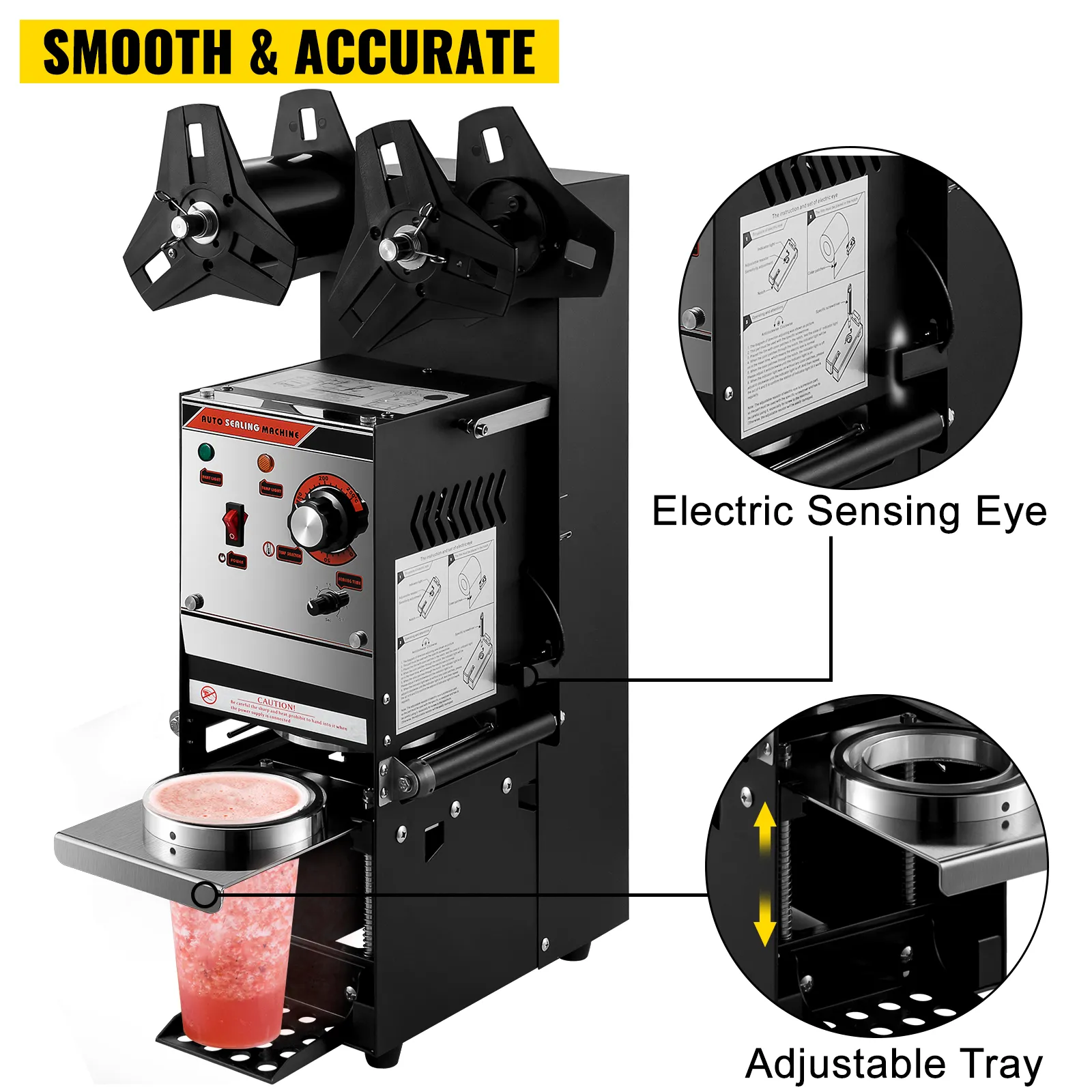 Der Dichtungsfilm sollte über die elektrische Augenerfassung laufen. Diese Technologie sorgt für eine genaue Ausrichtung an der Dichtung und einen reibungslosen Betrieb mit einem geringen Dichtungsfehler. Das Design eines verstellbaren Tabletts ermöglicht es Ihnen, verschiedene Tassen mit unterschiedlichen Höhen abzudichten.