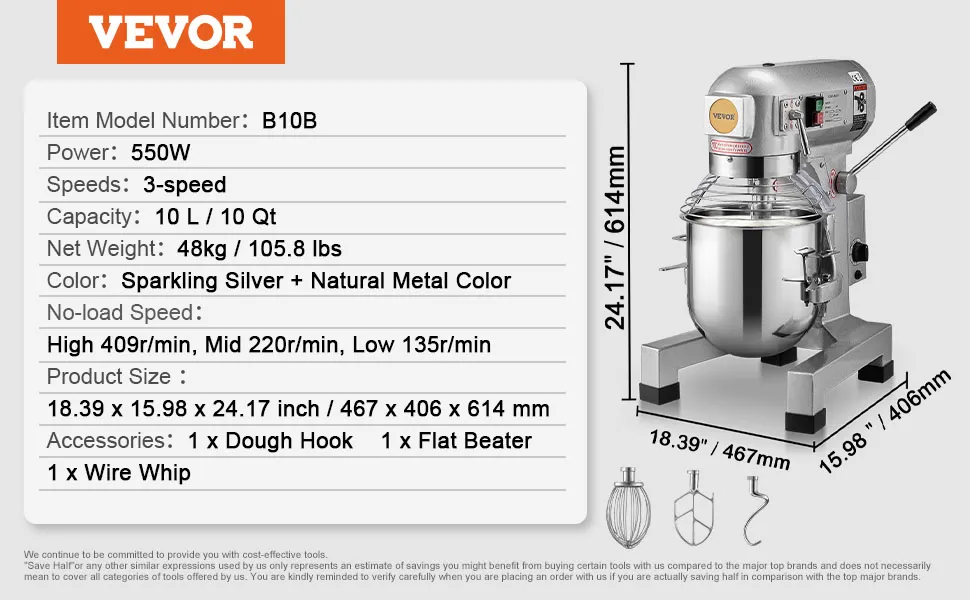VEVOR Kommerzieller Küchenmixer, 10 l kommerzieller Standmixer mit 3 einstellbaren Geschwindigkeiten, 550 W Teigmixer mit Edelstahlschüssel und 3 Mixaufsätzen, ideal für Restaurant, Bäckerei, Konditorei, Café
