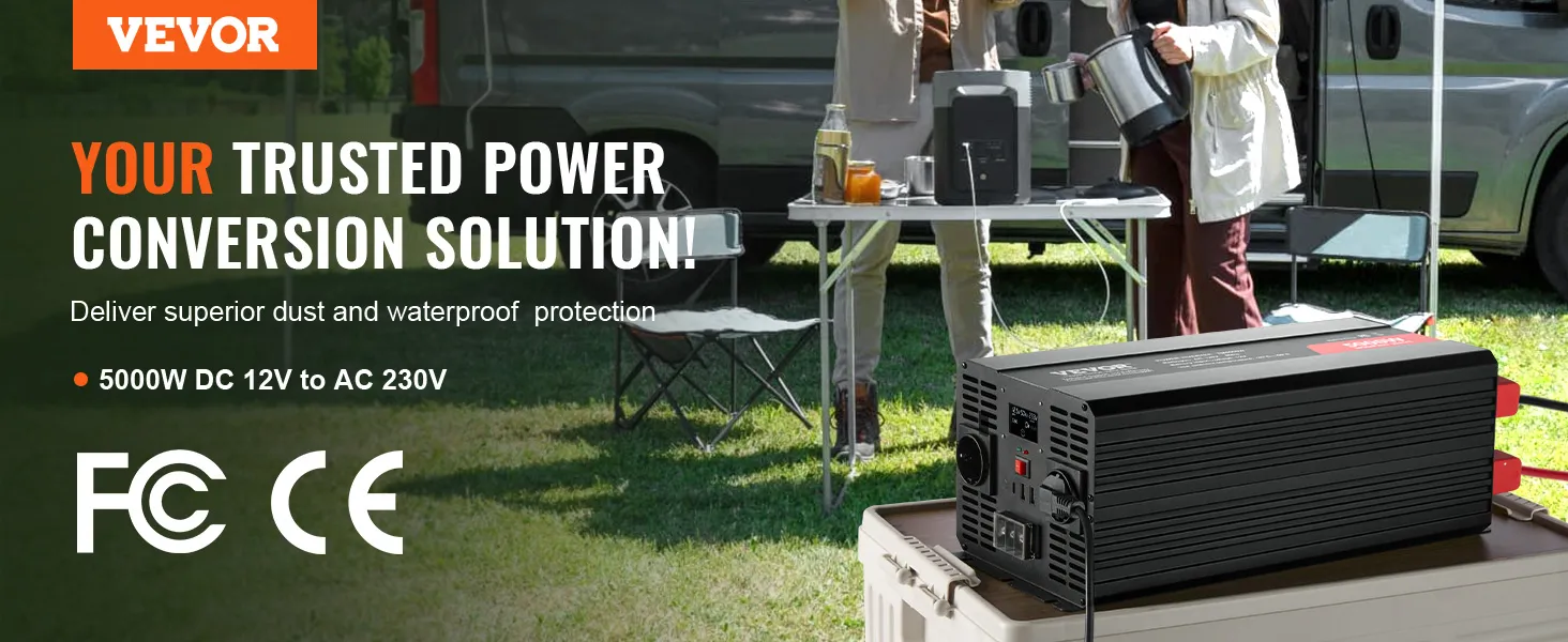 Modifizierter Sinus-Wechselrichter: Wandeln Sie mühelos 12 V Gleichstrom in stabilen 230 V Wechselstrom um. Mit 5000 W Dauerleistung und einem Wirkungsgrad von bis zu 88 % bei voller Last ist unser Wechselrichter die richtige Wahl für Haushaltsgeräte mit hoher Last wie Kühlschränke, Waschmaschinen, Klimaanlagen, Öfen, Computer, Fernseher usw. (Die Gesamtleistung der angeschlossenen Geräte sollte die Nennleistung des Wechselrichters nicht überschreiten. Bei höherem Leistungsbedarf sollten Sie unsere Hochlastmodelle in Betracht ziehen.)