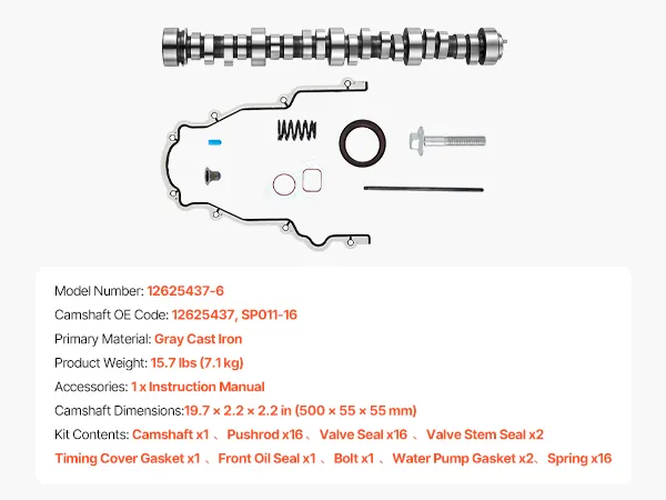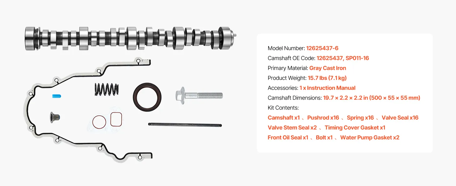 Komplettsatz: Nockenwelle OE: 12625437, SP011-16. Dieser Nockenwellensatz enthält 9 Komponenten: Nockenwelle, Stößelstangen, Federn, Steuerdeckeldichtung, Wasserpumpendichtung und mehr. Alle Kernteile entsprechen den OEM-Spezifikationen