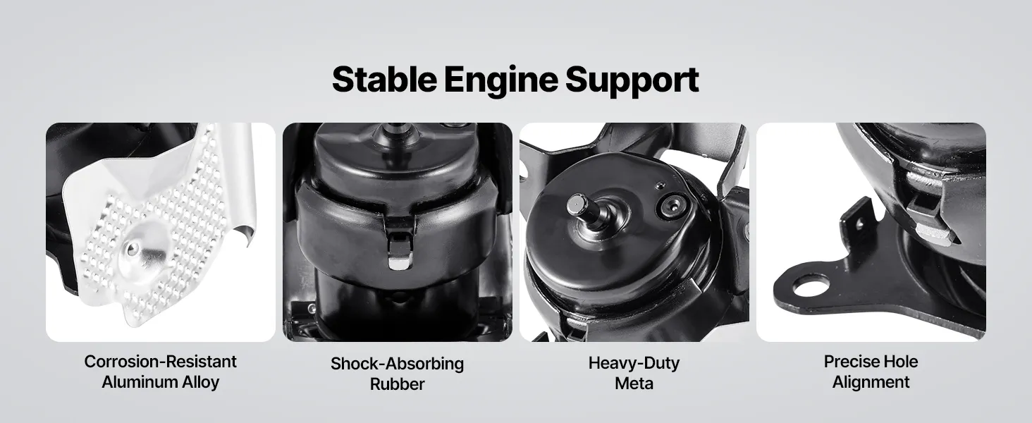 Der rechtzeitige Austausch verschlissener Teile mit diesem Motorlagersatz sorgt für ein reibungsloses Fahrerlebnis. Er fixiert den Motor an seinem Platz, verhindert Erschütterungen während des Betriebs und absorbiert Vibrationsenergie, um die Geräuschübertragung in den Innenraum zu reduzieren und so den Komfort zu erhöhen.