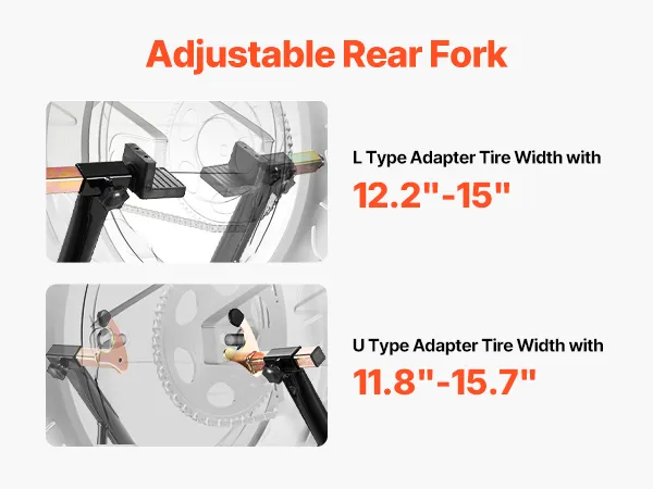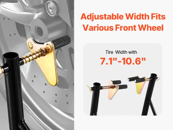 Verstellbare Universal-Gabelköpfe: Der doppelte Gabelkopf des Vorderradständers ist in der Breite von 7,1 bis 10,6 Zoll (18,03 bis 26,92 cm) verstellbar, während der U-förmige Gabelkopf des Hinterradständers in der Breite von 11,8 bis 15,7 Zoll (29,97 bis 39,878 cm) und der L-förmige Gabelkopf in der Breite von 12,2 bis 15 Zoll (30,988 bis 38,1 cm) verstellbar ist. Dies gewährleistet einen festen Sitz auf beiden Seiten des Fahrzeugs und sicheren Halt