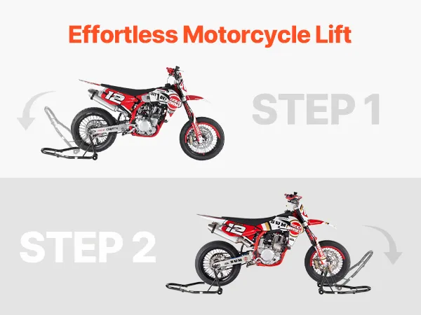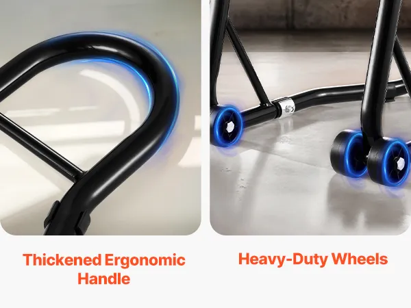 Anheben in Sekunden: Unser Motorrad-Gabelstaplerständer ist mit 4 PP-Rollen und einem verlängerten Griff ausgestattet, sodass Sie Ihr Motorrad mühelos in 2-3 Sekunden anheben können. Es erleichtert Wartung, Ölwechsel und Reinigung, und bei längerer Lagerung wird keine Reifenkompression verursacht, wodurch platte Reifen oder Undichtigkeiten vermieden werden