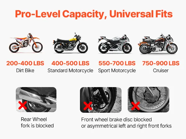 Verbesserte Tragkraft von 500 kg: Die Vorder- und Hinterradständer können zusammen bis zu 500 kg tragen und sind somit für Fahrzeuge mit einer Reifenachsbreite von 35,1 cm oder weniger geeignet. Sie decken die meisten Motorräder ab, darunter Marken wie Yamaha, Kawasaki, Honda, Suzuki und mehr