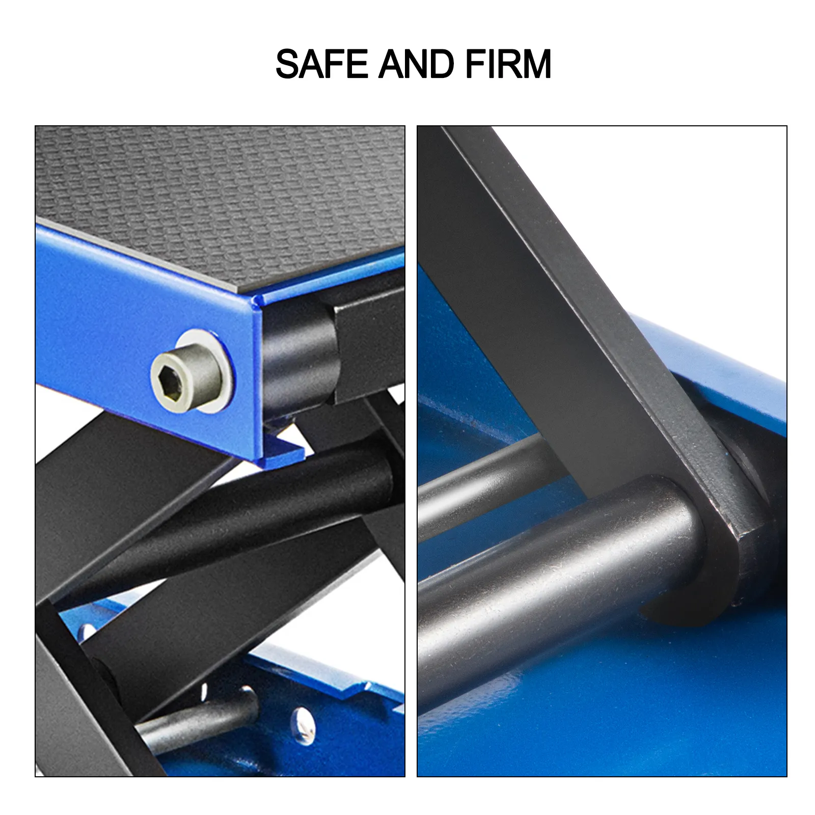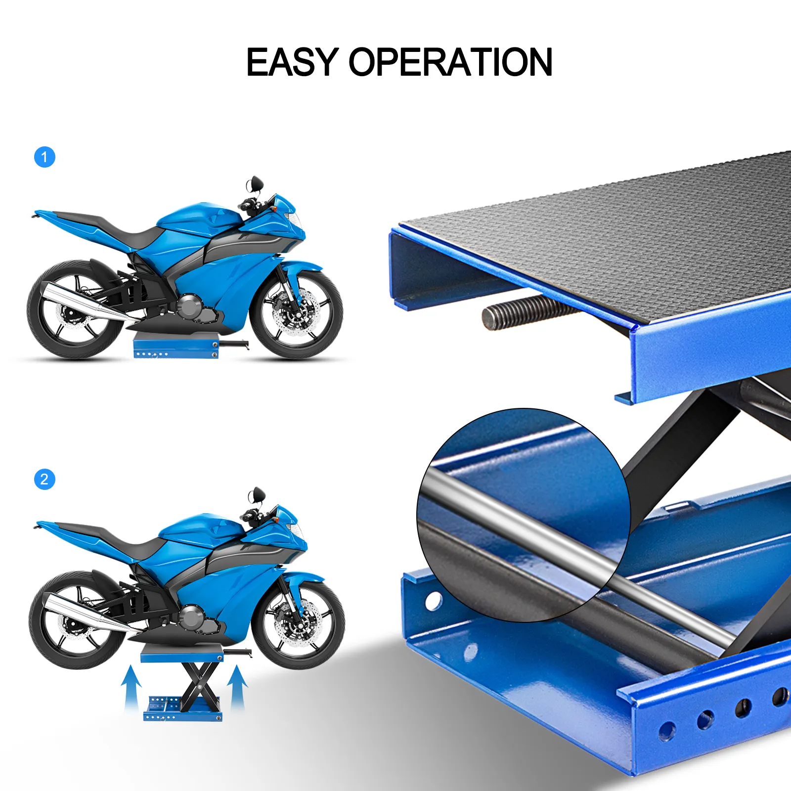 • 【1100 PFUND LASTKAPAZITÄT】 - Der Motorrad-Scherenheber hat eine hervorragende Tragfähigkeit von ca. 1100 Pfund, sodass Sie fast alle Motorräder heben können. Es ist auch mit einem flachen und breiten Deck ausgestattet, das das Gewicht eines Fahrrads gleichmäßig tragen kann.