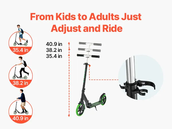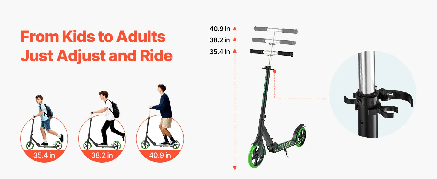 Höhenverstellbar: Verstellbarer Lenker mit drei Höheneinstellungen: 35,4 / 38,2 / 40,9 Zoll (900/970/1040 mm). Dieser Kinder-Tretroller wächst mit Ihrem Kind mit und passt sogar Erwachsenen – kein häufiges Austauschen erforderlich