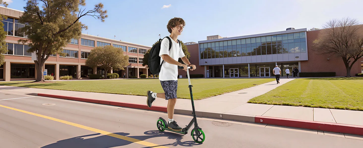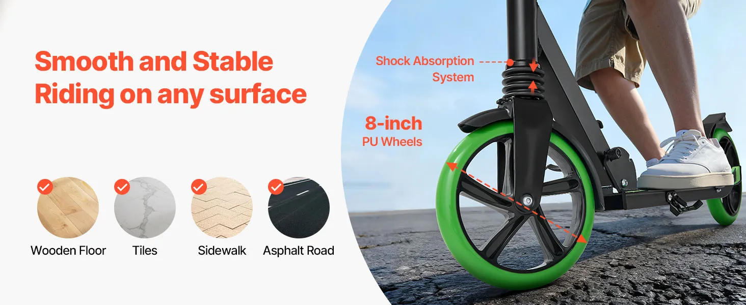 8-Zoll-Stoßdämpferräder: Mit hochelastischen PU-Rädern und einem Stoßdämpfungssystem bietet dieser Roller für Kinder eine ruhigere und stabilere Fahrt. Er gleitet leicht über Asphalt, Gehwege, Holzböden und Fliesenböden und reduziert Stöße und Lärm