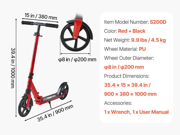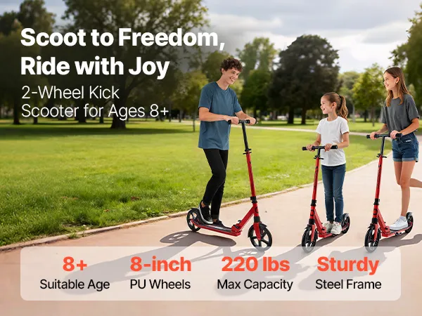 VEVOR Scooter (2 Räder) für Kinder ab 8 Jahren, Cityroller Kinderroller Straßenroller mit höhenverstellbarem Lenker & rutschfestem Deck, faltbarer Tretroller bis zu 100 kg, Schwarz + Rot