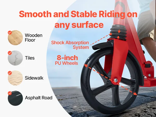 8-Zoll-Stoßdämpferräder: Mit hochelastischen PU-Rädern und einem Stoßdämpfungssystem bietet dieser Roller für Kinder eine ruhigere und stabilere Fahrt. Er gleitet leicht über Asphalt, Gehwege, Holzböden und Fliesenböden und reduziert Stöße und Lärm