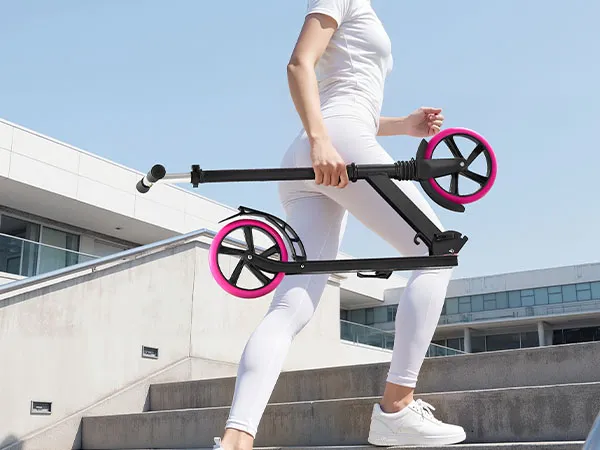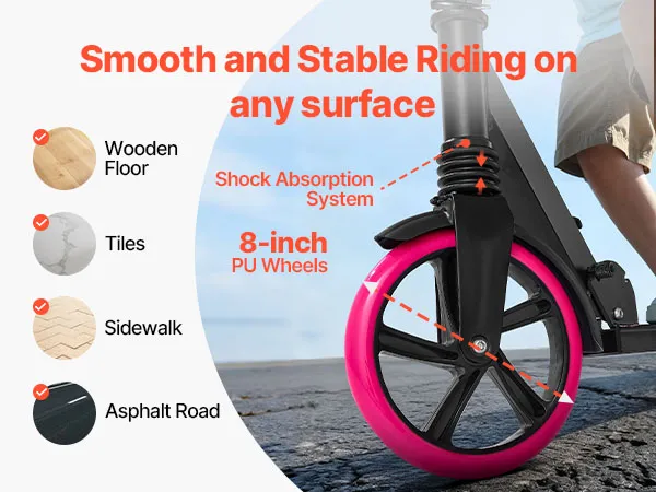 8-Zoll-Stoßdämpferräder: Mit hochelastischen PU-Rädern und einem Stoßdämpfungssystem bietet dieser Roller für Kinder eine ruhigere und stabilere Fahrt. Er gleitet leicht über Asphalt, Gehwege, Holzböden und Fliesenböden und reduziert Stöße und Lärm