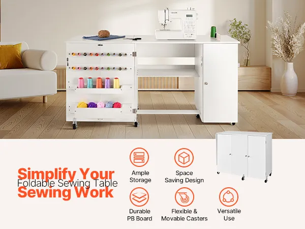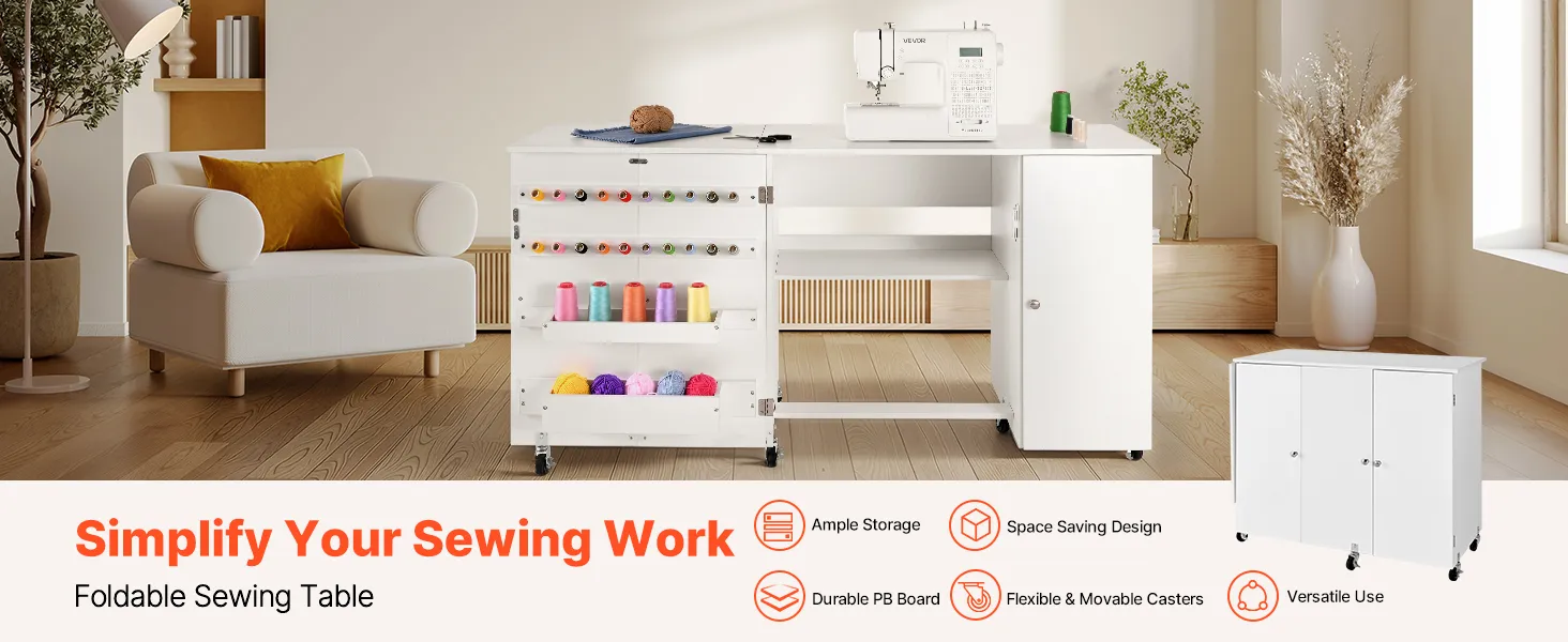 Dieser klappbare Nähtisch bietet viel Stauraum und ermöglicht die einfache Organisation von Nähutensilien und -materialien. Das klappbare Design spart Platz, wenn er nicht gebraucht wird, während die flexiblen Rollen leichtgängig sind. Der Tisch aus PB-Platte ist verschleißfest. Er eignet sich auch gut als Arbeits- oder Präsentationstisch.