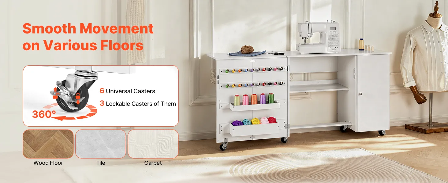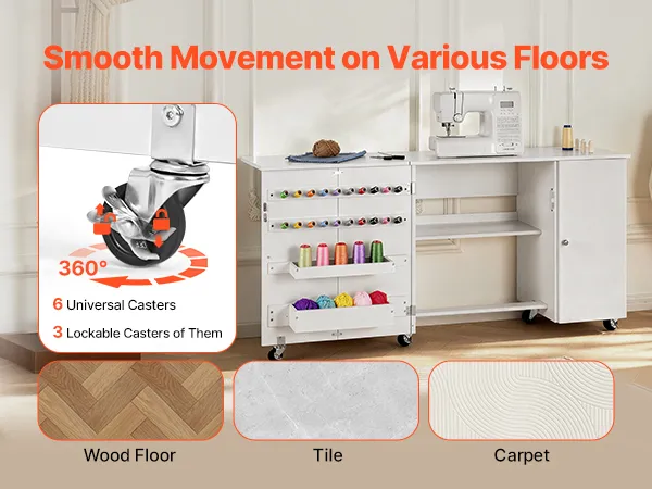 Leicht zu bewegen: Ausgestattet mit drei 360° drehbaren Rollen und drei feststellbaren Rollen können Sie den Nähtisch problemlos überall hin bewegen. Die feststellbaren Rollen sorgen für Stabilität während des Gebrauchs, während die 360°-Drehung flexible Bewegungen ermöglicht