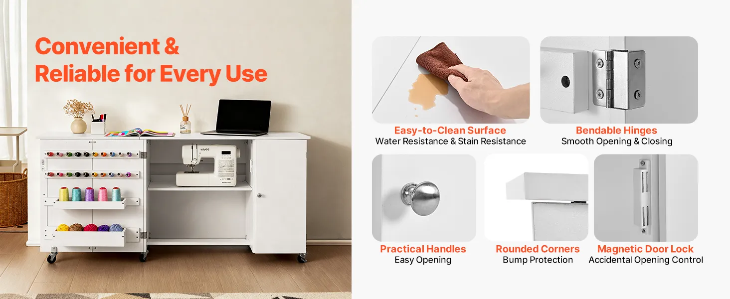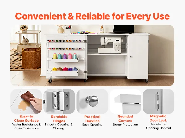 Dieser Nähtisch mit Stauraum verfügt über eine wasserdichte, schmutzabweisende Oberfläche für eine einfache Reinigung, biegsame Scharniere für langlebiges, sanftes Öffnen/Schließen und einen Griff für einfachen Zugang zu Schränken/Schubladen. Die abgerundeten Ecken verhindern Stöße, und das magnetische Türschloss verhindert, dass die Tür versehentlich aufspringt.