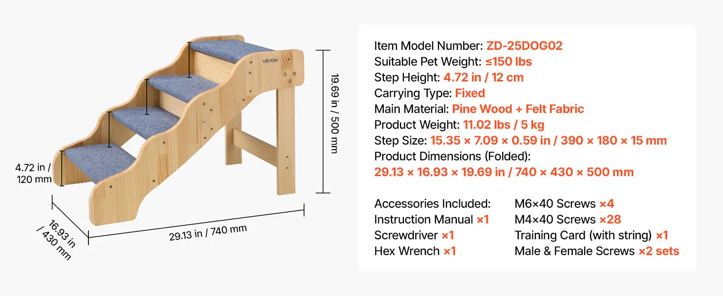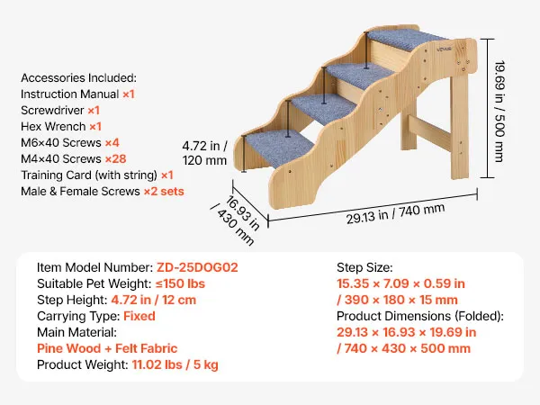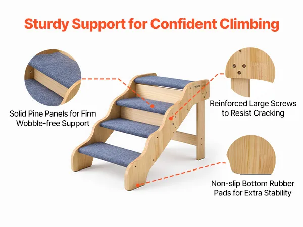 Stabile und sichere Unterstützung: Die Hundetreppe besteht aus einem robusten Holzrahmen, der Haustiere bis zu 68 kg trägt. Große Schrauben sorgen für zusätzliche Stabilität, und rutschfeste Gummifüße verhindern Wackeln und ermöglichen Ihrem Tier einen sicheren Aufstieg