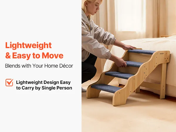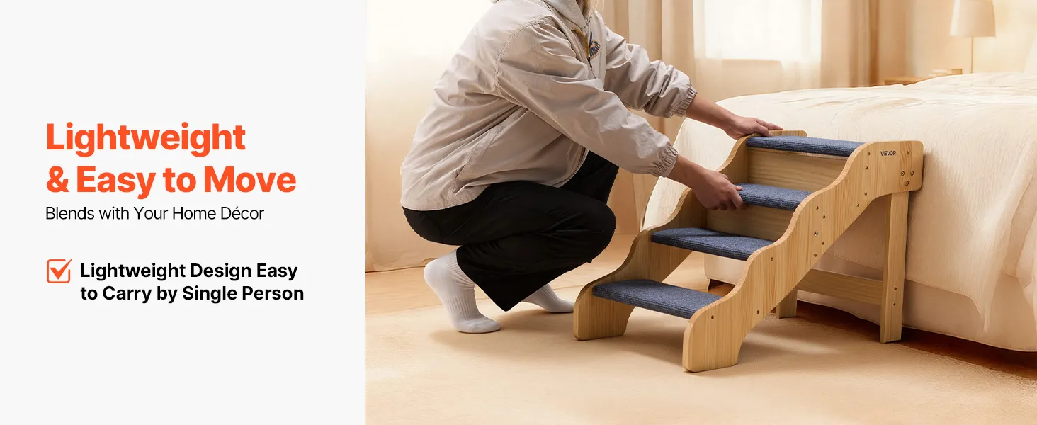 Das 4-stufige Design hilft Haustieren jeder Größe, insbesondere älteren, verletzten oder in ihrer Beweglichkeit eingeschränkten Tieren, sicher auf Betten und Sofas zu gelangen. Die stabile Konstruktion bietet Halt, während das geringe Gewicht ein einfaches Umstellen ermöglicht. Das schlichte, klare Design fügt sich nahtlos in jede Einrichtung ein.