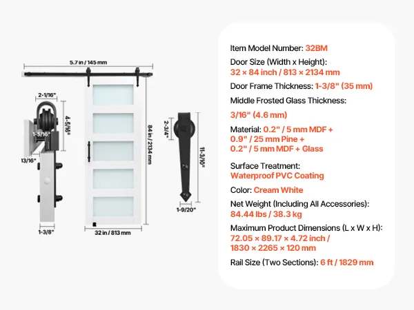 Produktabmessungen: Türgröße: 32 x 84 Zoll (813 x 2134 mm). Die maximale Öffnungsgröße entspricht der Breite des Scheunentors minus 2 Zoll und der Höhe des Scheunentors minus 2 Zoll. Beispielsweise beträgt die maximale Öffnung bei einer 32 x 84 Zoll (813 x 2134 mm) großen Tür 30 Zoll (76,2 cm) Breite und 82 Zoll (2,08 m) Höhe