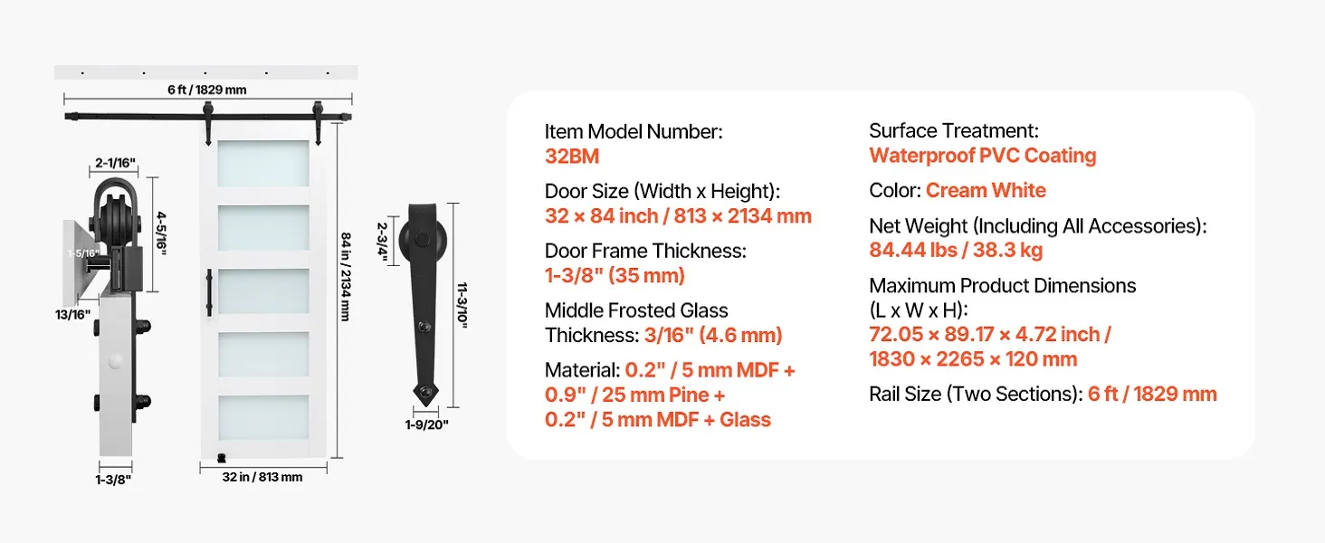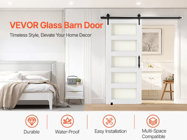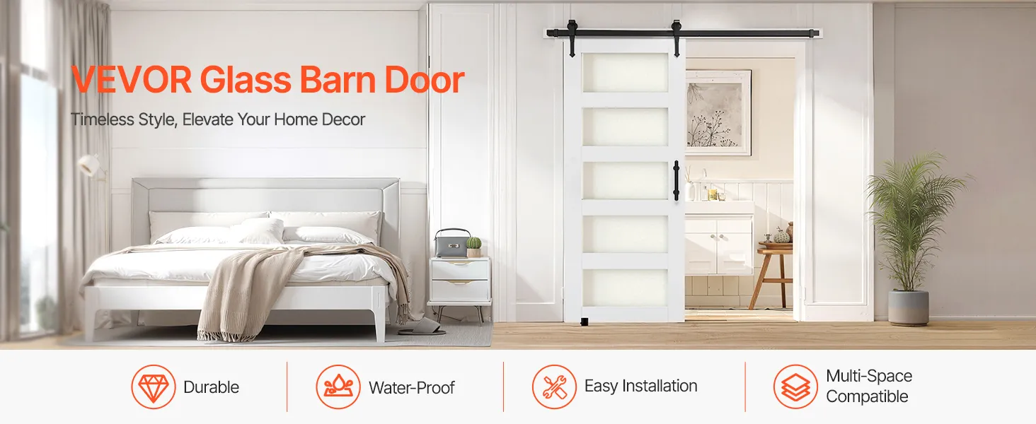 VEVOR Schiebetür im Scheunenstil Schiebetürsystem (813 x 2134 mm) aus hochfesten MDF-Platten & Milchglas, Scheunentor mit Hardware-Kit & wasserfester PVC-Oberfläche & H-Rahmen für Badezimmer