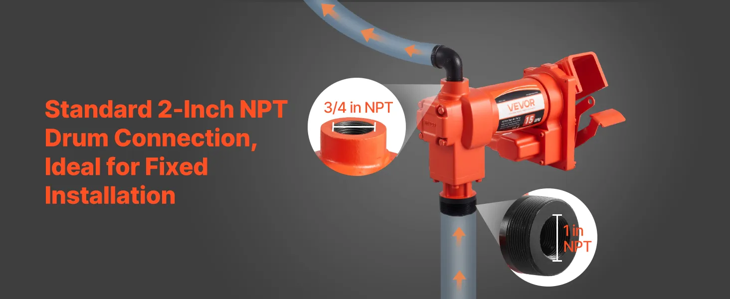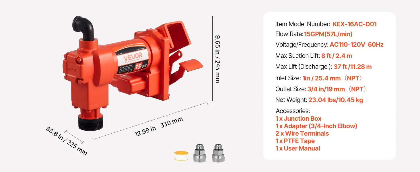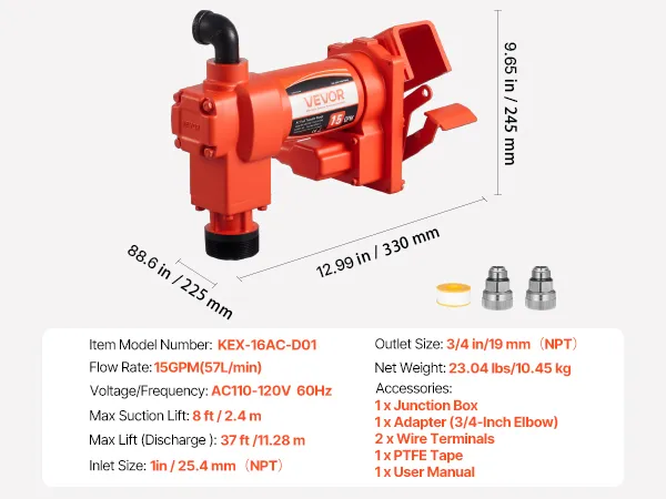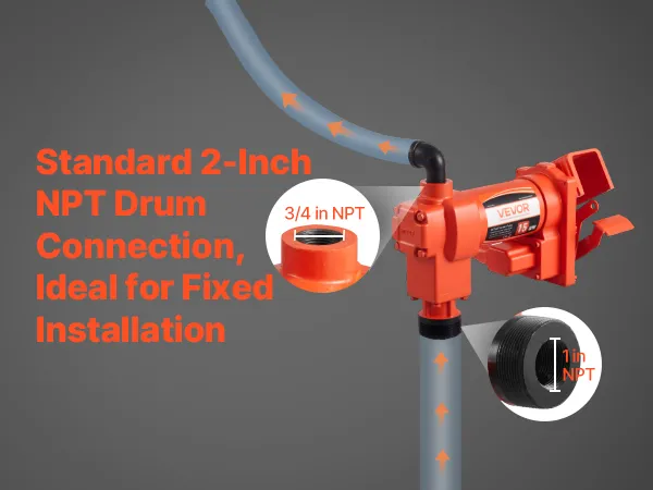 Standard-Einlass- und Auslassgröße: Mit einer Standard-Einlassgröße von 1 Zoll/25,4 mm und einer Auslassgröße von 3/4 Zoll/19,05 mm bietet diese elektrische Diesel-Transferpumpe eine einfache Installation und breite Kompatibilität