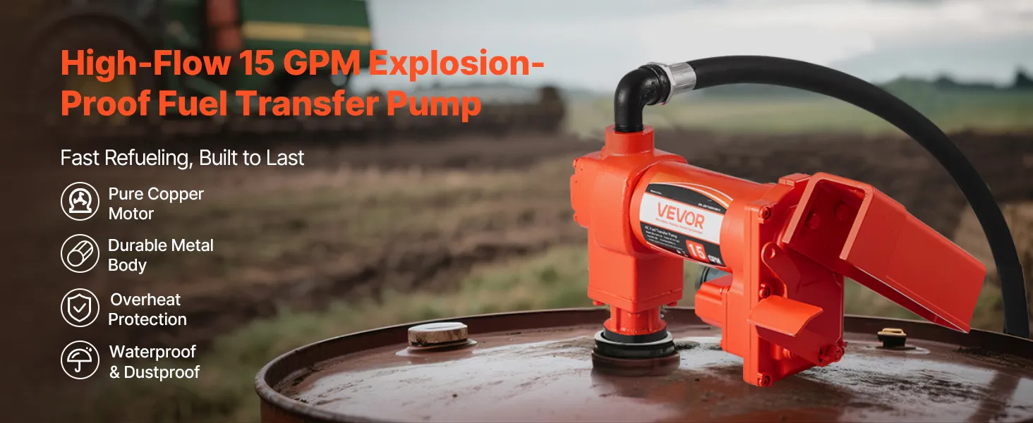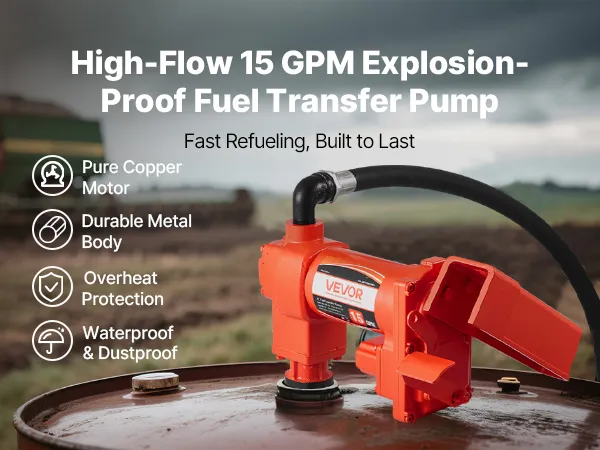 Schnelle Kraftstoffübertragung mit einer maximalen Durchflussrate von 57 l/min (15 GPM), einer maximalen Saughöhe von 2,4 m (8 ft) und einer maximalen Förderhöhe von 11,28 m (37 ft). Mit einem Motor aus reinem Kupfer, einem Pumpenkopf aus Gusseisen und integriertem Überhitzungsschutz bietet diese Pumpe zuverlässige Leistung und sicheren Betrieb für Diesel, Kerosin und Biodiesel.
