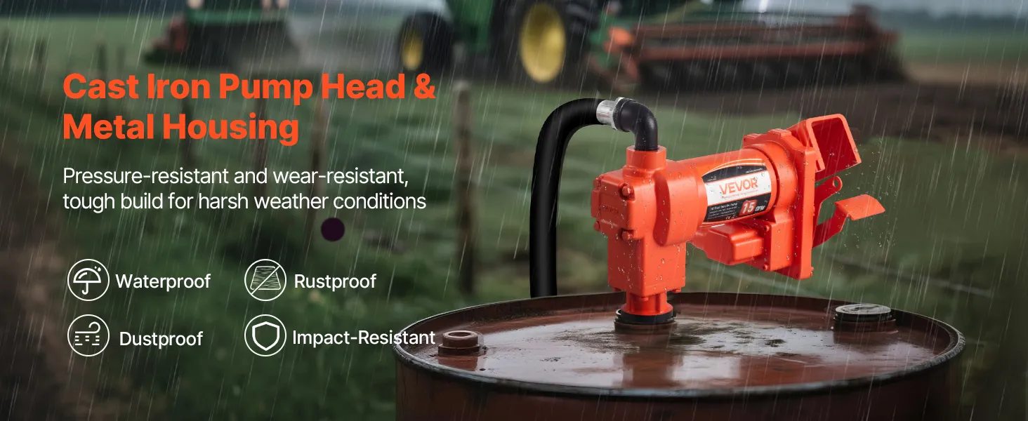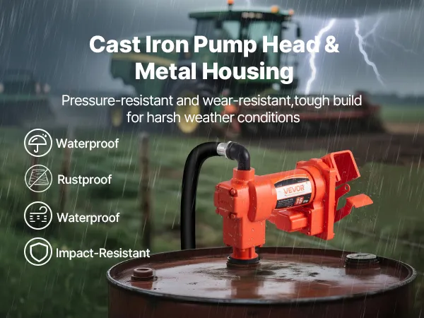Robuste Gusseisenkonstruktion: Gusseisen für hohe Druck-, Verschleiß- und Korrosionsbeständigkeit. Diese 230-V-Diesel-Transferpumpe mit wasserdichtem Schalter verhindert das Eindringen von Wasser in Außenbereiche und feuchte Umgebungen.