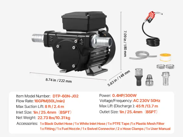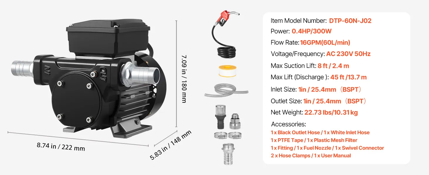 VEVOR Kraftstoff-Transferpumpe, 230 V AC, elektrische Diesel-Transferpumpe, 60 l/min, mit automatischer Abschaltung der Kraftstoffdüse, 2 Schläuchen, 13,7 m Förderhöhe, für Kerosin, Biodiesel